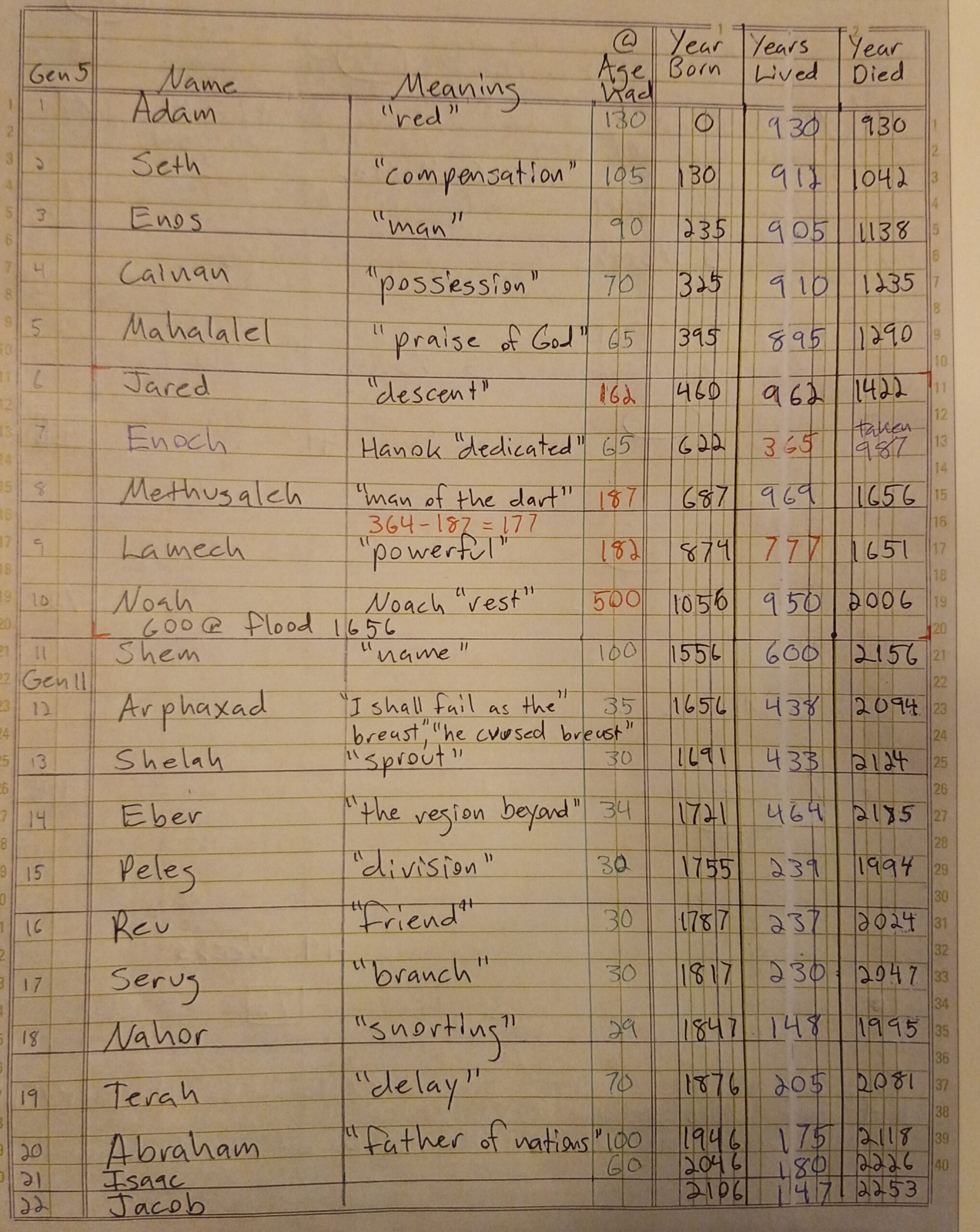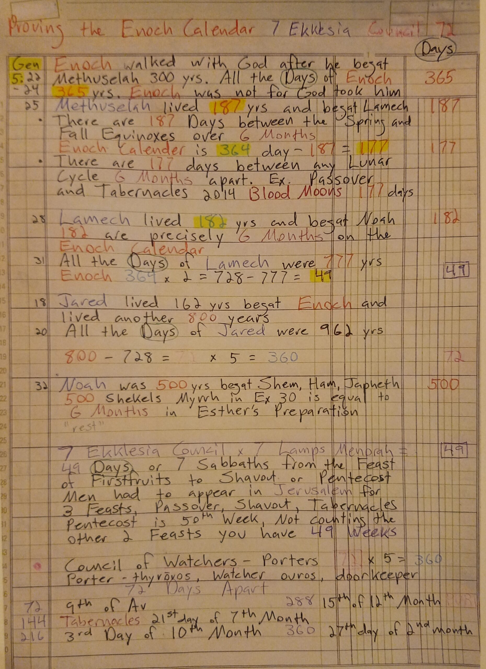 {2:10 min mark} Here are our notes! And before we get into it, let’s do a quick re-cap. In previous video, we saw the proof of the Enoch Calendar by observing the people in Genesis chapter 5. Enoch {365 years, verse 23}, Methuselah {187 years, verse 25}, Lamech {182 years, verse 28}, Jared {162 years, verse 18}, Noah {500 years, verse 32}.