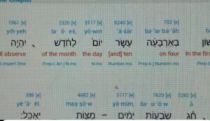 {19:43 min mark} Here’s an app called Bible Hub and in it we can actually see something which is really helpful for us. If we look closely what you’ll notice is it will have the words in English and it will have the words in Hebrew and then the way you say the word in Hebrew. It’s called a trans literation.