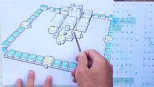 The way that we understand that and we can explain it in simple terms, is that first off, the Month has 30 Days. And there are 30 Chambers, which you will see here in green, going around. This is one of our earlier sketches, and once we started to draw and get the Temple Complex in 3D, this is what it looks like: